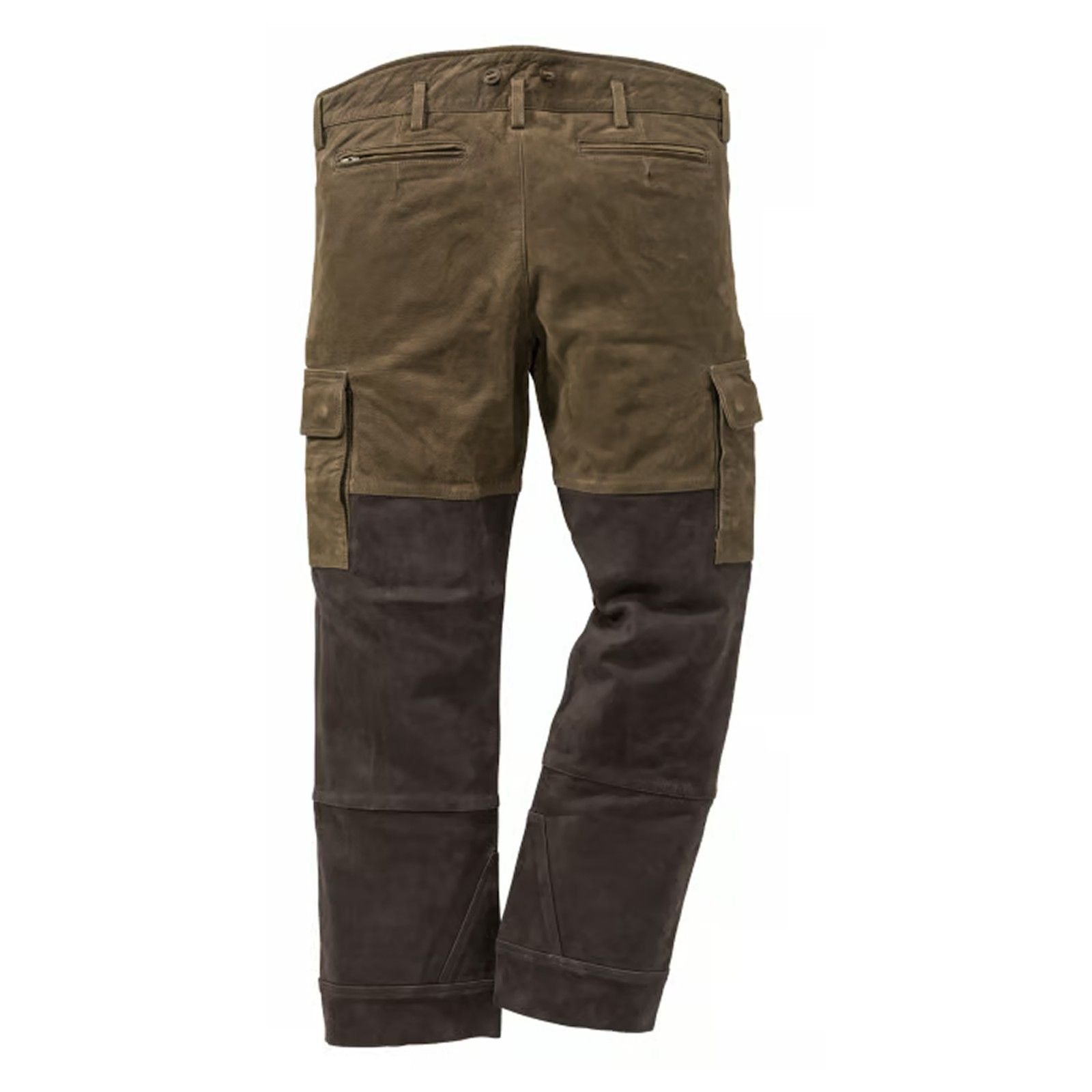 Constructed from premium full-grain leather and soft, brushed suede panels, the trousers are designed to withstand harsh terrain and unpredictable weather while allowing for unrestricted movement. The upper section is made from supple yet durable leather that molds to the wearer over time, developing a rich patina unique to each individual. The contrasting darker leather panels on the lower legs provide additional reinforcement in high-wear areas such as the knees, calves, and seat — ideal for stalking, rough shooting, or extended walks across challenging landscapes.